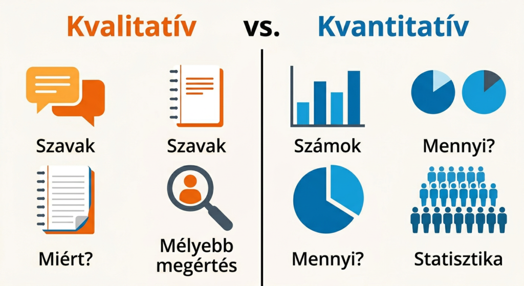 | Fő cél | Megérteni a „miértet” és a „hogyan”-t | Megmérni a „mennyit” és a „milyen gyakran”-t |